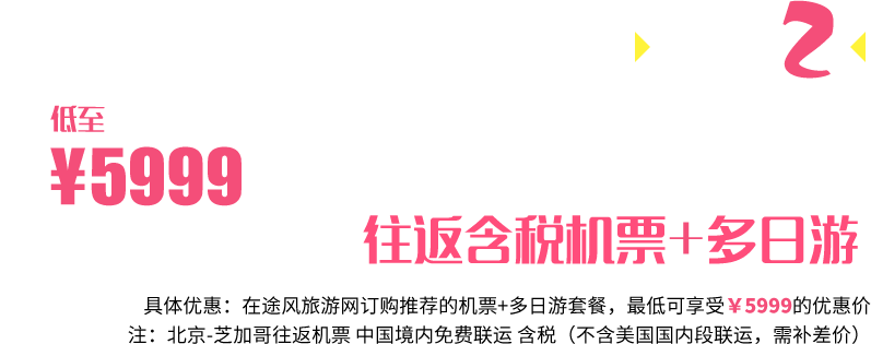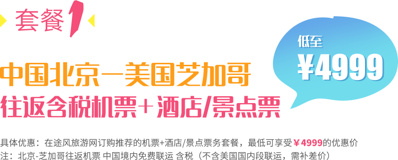 • 2 以上优惠套餐中,中国境内城市的免费联运机票含税,美国境内的联运机票需另行补差价。具体出发城市及套餐内容详情请点击查看专属活动页面