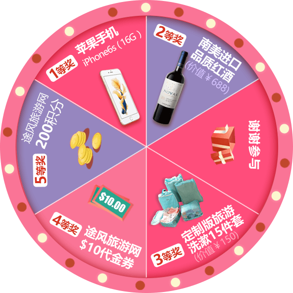 • 4 转盘抽奖活动有效期为2016年9月25日至2016年9月29日,抽奖获得的实物奖品,需按照抽奖页面提示填写收货地址、联系方式,如未能填写有效收货地址和联系方式,视为主动放弃。同一客户1/2/3等级不可重复中奖,以价值最高奖品为准,抽奖细则以抽奖页面提示为准,如有产品服务及质量问题,由客户与途风旅游网协商解决,工行不承担相应责任更多工行环旅卡权益,点击查看